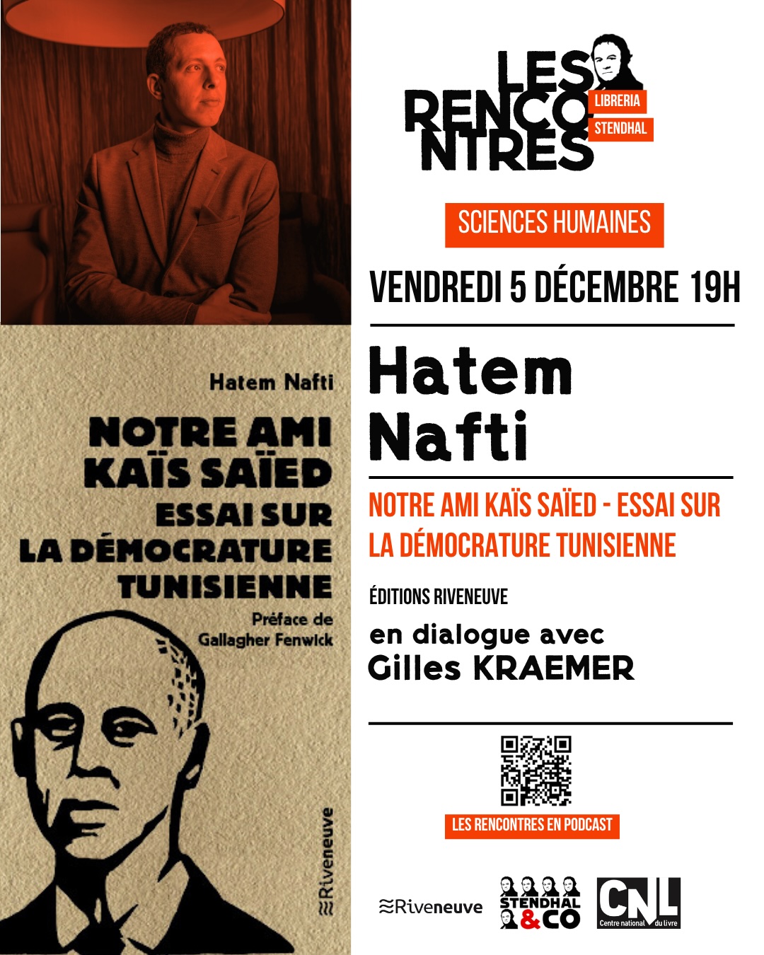 Venez découvrir Hatem Nafti à la libraire Stendhal, librairie francophone de Rome. L'auteur sera présent le vendredi 5 décembre à 19h pour présenter son essai Notre ami Kaïs Saïed – Essai sur la démocrature tunisienne.