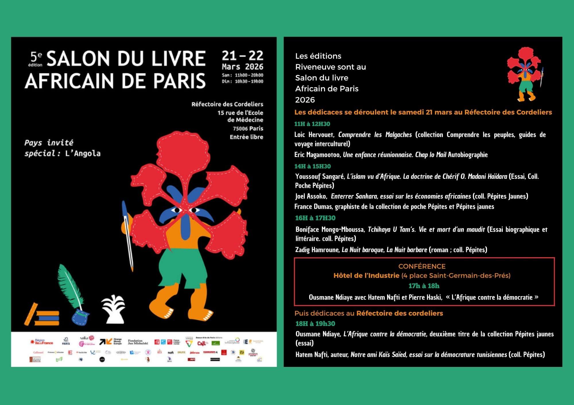 Les éditions Riveneuve sont au Salon du livre Africain 2026, le week-end du 21/03 au 22/03. Nous serons présent sur le stand le samedi 21 mars pour les dédicaces au réfectoire des Cordeliers. Il y aura également une conférence d'Ousmane Ndiaye avec Hatem Nafti et Pierre Haski, "L'Afrique contre la démocratie" de 17h à 18h […] |