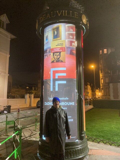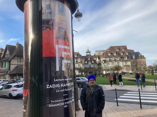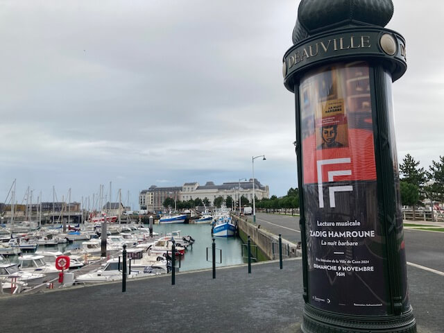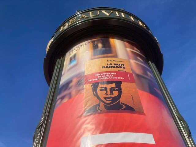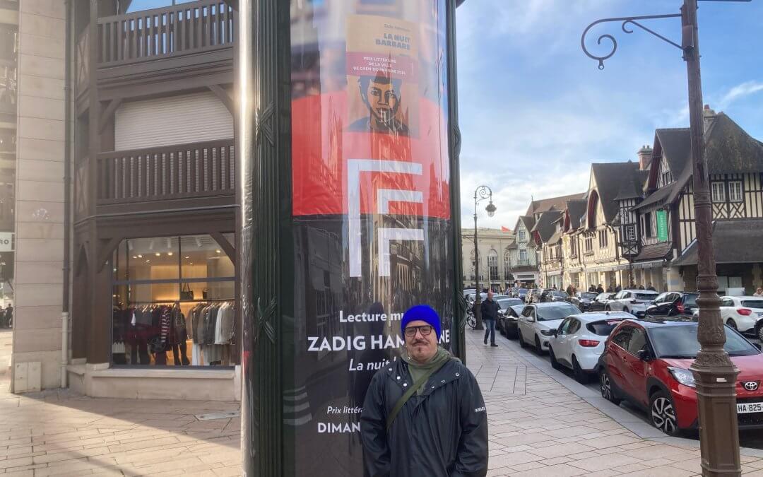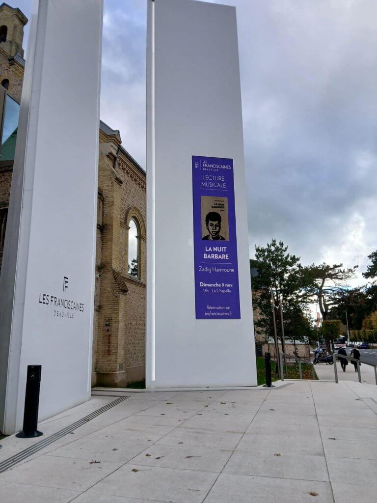 Sur toutes les colonnes Morris de la cité balnéaire à deux heures de Paris s’affiche en lettres capitales la couverture du dernier ouvrage de Zadig Hamroune, La Nuit barbare, barrée du bandeau rouge « Prix de la ville de Caen ». Nous sommes en Normandie, l’auteur est sur son territoire : né à Caen, éduqué à Hérouville avant Paris et Londres, actuellement en résidence aux Franciscaines de Deauville, le superbe centre culturel au sein d’un ancien couvent totalement re-designé, qui accueille le spectacle de lecture musicale le dimanche 9 novembre dans « la Chapelle », et chargé d’ateliers d’écriture au lycée André Maurois.