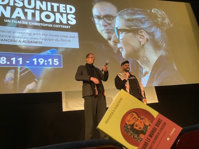 Hasard du calendrier, la tournée de promotion du documentaire sur Francesca Albanese, rapporteuse spéciale des Nations unies pour les territoires palestiniens, « Desunited Nations », du réalisateur Christophe Cotteret, tombe au moment de la sortie de l’essai attendu du politiste Jérôme Heurtaux : Le droit international est-il mort à Gaza ? Deux soirées ont drainé un tel public qu’il a fallu faire deux projections à chaque fois : le lundi 18 novembre au Forum des images à Paris et le lendemain au cinéma Galeries, dans les fameuses Galeries royales de Bruxelles.