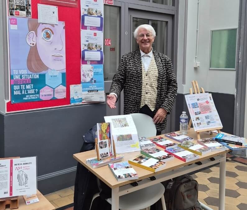 Dans l’aile gauche, au fond, Loïc Hervouet disposait d’une demi-table pour son ouvrage Une vie de journaliste – 100 histoires d’éthique et d’une table entière pour la collection « Comprendre les peuples », dont le tout dernier titre, Comprendre les Canadiens, était présenté avant même sa disponibilité en librairie, ce qui a convaincu quelques acheteurs.