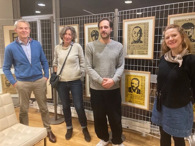 Le vernissage a eu lieu le jeudi 15 janvier avec une quinzaine de voisins-voisines et d’auteurs autour de l’artiste, qui a exposé sa technique de la taille d’épargne (on creuse ce qui apparaîtra en blanc) pour graver à la gouge de petites gommes qui feront de grandes et belles couvertures de la collection Pépites, emblématique de la maison.